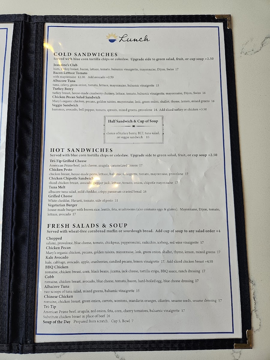 Two scoops of tuna salad on mixed greens with balsamic vinaigrette. Served with a wheat-free cornbread muffin.